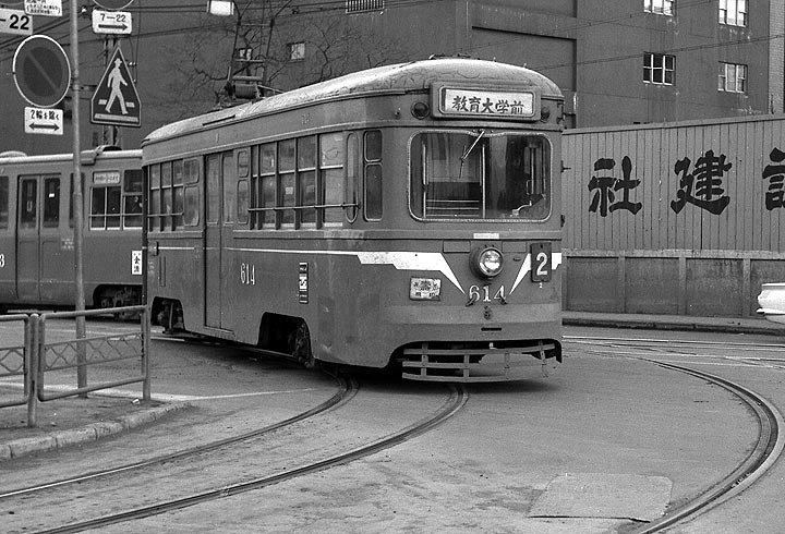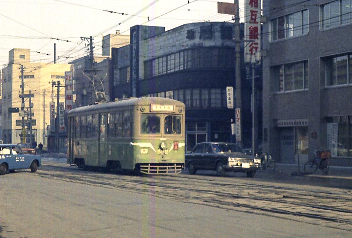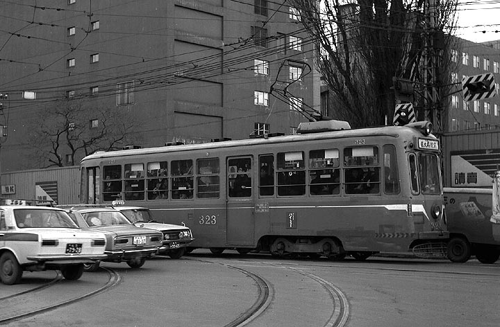 1969,3 こちらは跨線橋を渡らず医大病院方面に向かう323、320形は1957年ナニワ工機製。 |