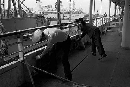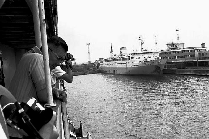1976,8 船に乗り込む人々 まもなく出航 桟橋の通路を上げ出航準備右には続行の便が