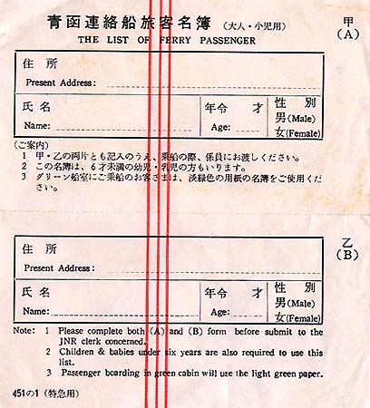 ここから青函連絡船までの長い競争がはじまる。通称200メートル競争とも呼ばれ、 大きな荷物を持って、時には駆け足でホームから階段、そして連絡線乗り 場までの長い通路を急ぐ様子は、 一種独特の雰囲気でした。特に夜行便では、カーペット部屋に寝るスペースを得る為必死でした。 我々が利用していた時は、まだドラも紙テープも規制がなく、テープを投げて見送るシーンにも何度も遭遇しました。 特に函館を発つ時に、別れの光景は多かったように感じます。 とにかく私にとって「船旅の印象」というのは、ほとんどが青函で得られたものでした。大シケで船が大揺れし、 横になって気持ち悪いのを必死にこらえたこ と。霧の航海で不安いっぱいだったこと。逆に静かな昼間の航海では、 寒い冬でもデッキで過ごし、去り行く函館山をいつまでも見ていたこともありました。 青函で食べる「イカ刺し定食(後にイカづくし定食)」の美味しかったこと。青函で出会い、函館で再会を期して分かれた 女の子・・・若き日の思いでは、今の方が鮮明に思い出されるから不思議です。 |