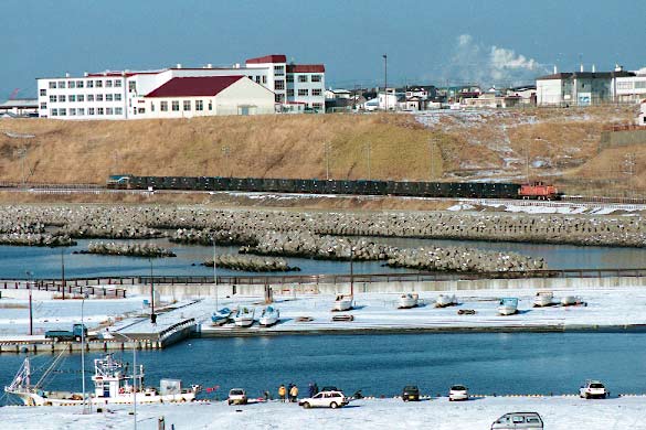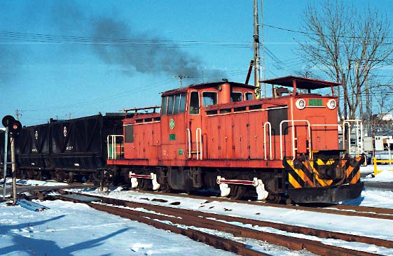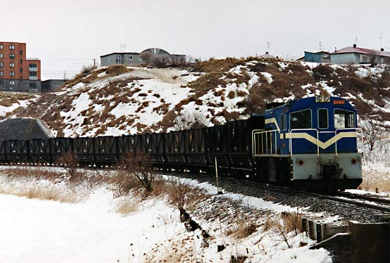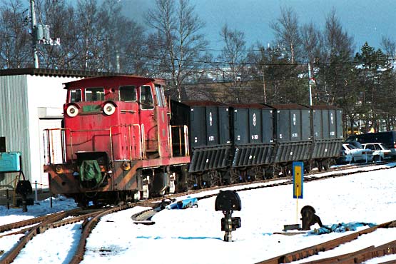 臨港鉄道を前身に持つ会社です。 1979年に臨港鉄道を吸収合併するカタチで発足し、臨港鉄道より引き継いだ東釧路ー春採ー知人ー臨港、東釧路ー城山とい う 路線で営業を開始しました。臨港鉄道時代は旅客営業も行っていましたが、1986年に国鉄東釧路の貨物取扱い中止により路線の 縮小を図り、その後は春 採ー知人の間4,0キロの営業となりました。太平洋炭鉱は海底の炭鉱で、地下深くから掘り出された石炭は ベルトコンベアで春採の選炭工場に運ばれる。以前はこの間は610mmゲージの凸型電気機関 車で運ばれていましたが、これまた 我々にはワンダーランドとも言うべき鉄道で、こちらは別のページで紹介させていただきます。さて春採の選炭場に運ばれた石炭は ここから鉄道の手によって知人の埠頭まで運ばれ、ここで船に積み替えられ、京浜地区に運ばれていました。列車ダイヤは平日10 往復程度の列車が設定されていましたが、出炭量で左右され、選炭工場に石炭が溜まったら運行されていたようです。通常12ユニット (二両連接の貨車を使用していたため24輌)、前後にDLをつけたプッシュプルで運転されていました。 |