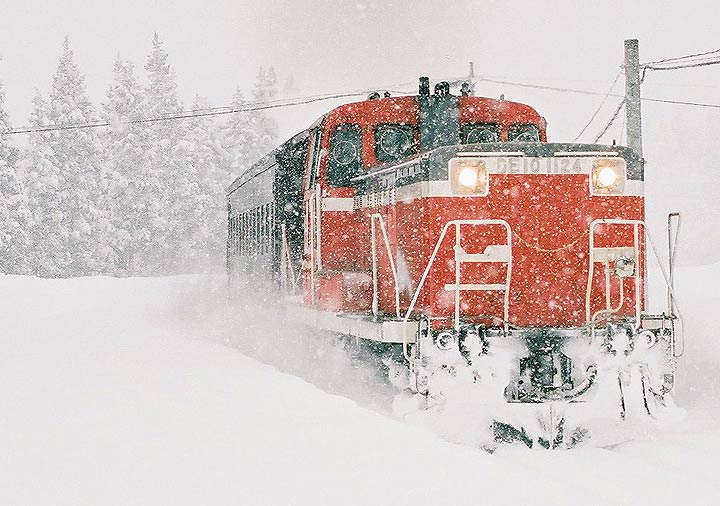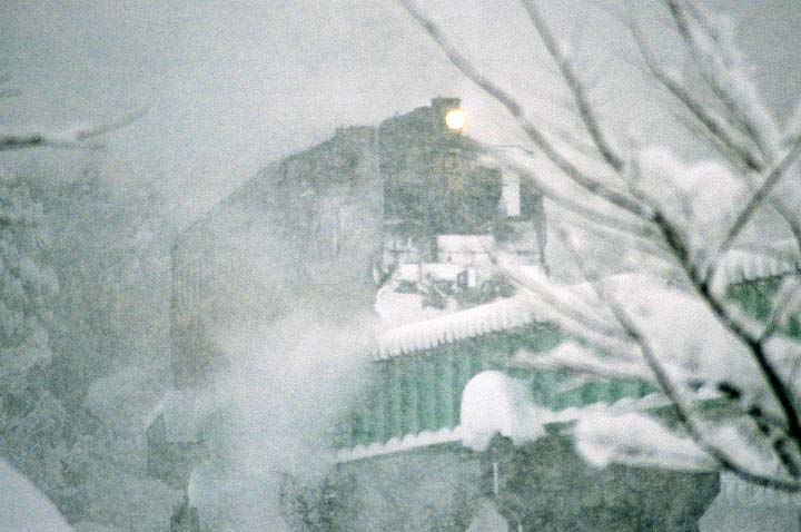 その情報が入った時、これはなんとしても 行かねばという思いを強く抱きました。現在の只見線、現役時代は只見以東はまだ 未完成で、若松側は会津線と呼ばれ ていましたが、こちらは何度か訪問したものの、 結局雪の中の姿を見ることができませんでした。30年ぶりの念願かなっての冬の 只見行きでしたが、それはま た久々の豪雪の中での撮影でもありました。前もよく 見えない状態の中から現れる蒸気機関車!! これも30年以上前に体験して以来の ことでした。そんな雪の中のシーン、大降りの雪でピンの甘いものもありますが、 宜しければご覧下さい。 |