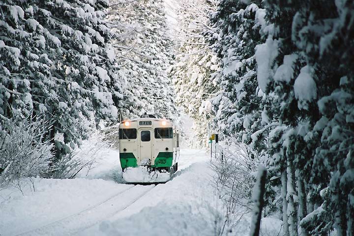 塔寺ー会津坂本 雪を被った木々のトンネルの中を行く気動車、このアングルで蒸気を撮りたかった。