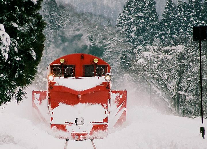 会津柳津ー会津坂本 雪煙を上げて走り去る、DE15の排雪列車。 |