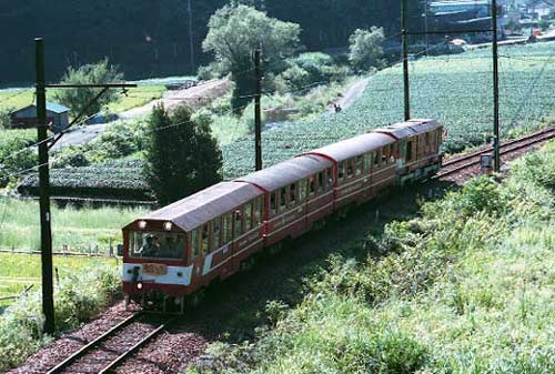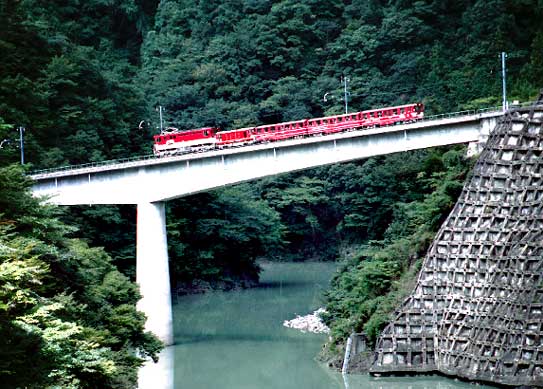 転されました。春は行くことが出来ませんでしたが、 これはどうしても見てみたい列車でした。その時の情報では秋にも運転されるとのことで、これは絶対に 行 きたいと思っていましたが、運良くこの眼で見ることが出来ました。しかもその当時つけていた「あかいし」 のヘッドマークが復活とのビックプレゼントつ き・・・このヘッドマークは昭和36年運転当時つけていたものが、 奇跡的に倉庫から発見されたものでした。ふだん蒸気機関車やいろいろな電車が走っている路線を、 標準軌とはいえナロー規格の列車が走るのですから興味は尽きません。駅のホームは乗車扉よりかな り 上の位置になりますし、またDD20牽引ですから運行可能なのですが、屋根から架線まではかなりの距離が あります。途中の乗降はホームとは別にステップ を置いて対処したそうです。また普通の車両と並ぶとその 大きさの差が際立ち、とてもかわいらしく見えました。新金谷発8時58分、途中千頭に10時40分着、 SL列車が1時間17分で行くところを1時間42分かけて走りました。乗客はツアーで募集でしたがほぼ 定員で、しかもハイカーが多く、鉄関係はあまり見ませんでした。また、この日は翌日の日曜日も同じ列車が 運転されるため、上り列車も接阻峡温泉より「あかいし」のヘッドマークをつけて、新金谷まで運転されました。 もっとも乗車できたのは、前述のツアー客で帰路も乗車を希望した方だけでしたが。 今回は写真の 撮影主体ということで車での撮影でしたが、速度が遅かったため普通に走っていても何度か撮影できました。 次回機会がありましたらぜひ乗車して、また一味違う旅を楽しんでみたいものです。 |