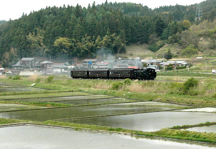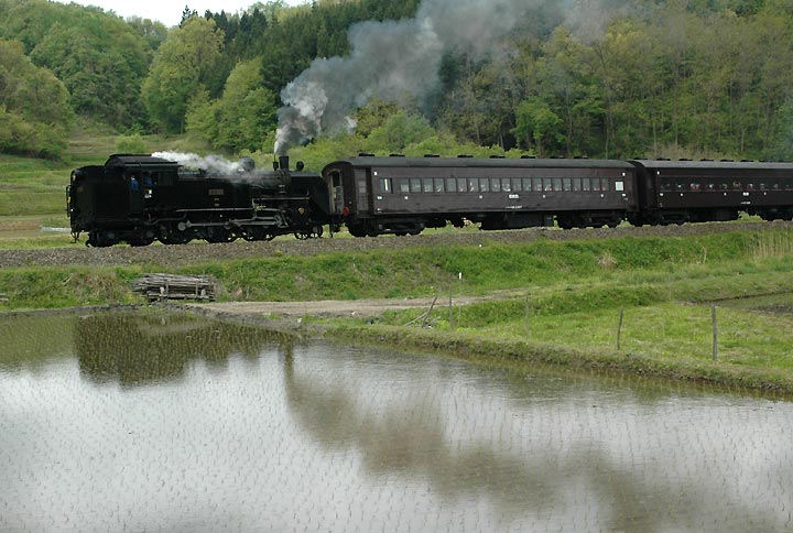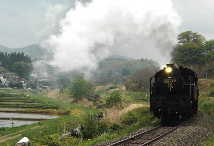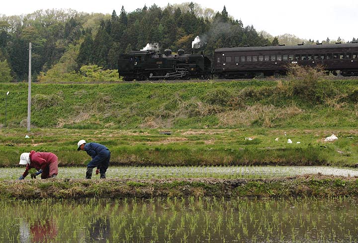 した。私は今回も試運転への訪問でしたが、 田んぼに丁度水の入る季節。日本的な風情とC11のドラフト音を楽しんできました。しかしこの時期になると 気温 が高くなり、煙の方はイマイチの状態でしたが、午後からは降りだした雨のおかげもあって、綺麗な 白煙が見られました。しかし今回が三回目の磐東ですが、い ずれも雨模様と言うのは、残念なのか天の 助けなのか・・・ また今回はネットでお付き合いいただいている方々に、今まで知らなかったポイントにも 案内して いただきました。おかげさまで、過去2回とはまた違った写真を撮ることができ、この場をかりて お礼申し上げます。写真はすべて5月18日撮影、また天候のおかげで、全般に暗めのシーン多めですが、 ご覧いただければ幸いです。 |