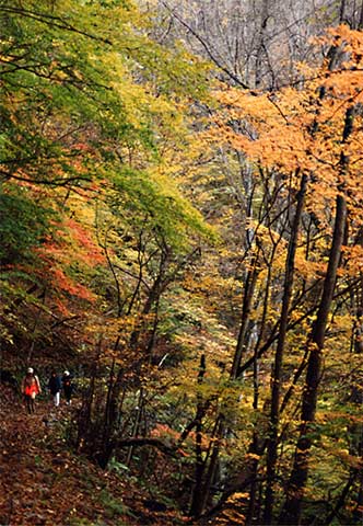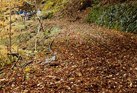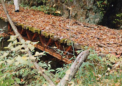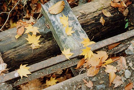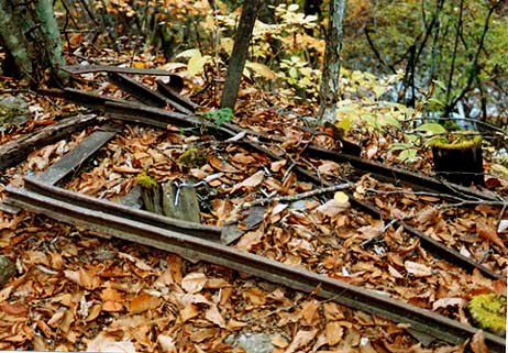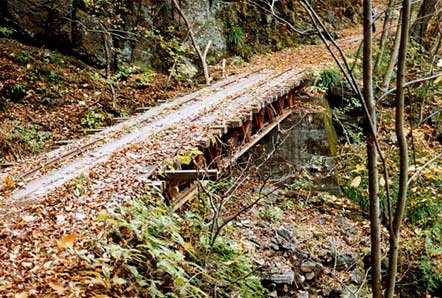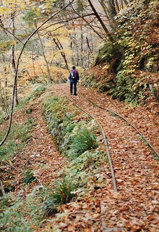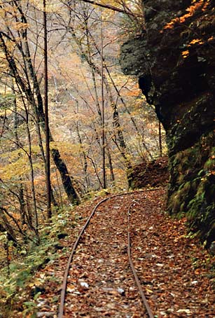 | 入川軌道跡は、ネット仲間の皆さんから話を聞いて、ぜひ行きたかったところです。そんなとき、 秋にここのハイキングが行われるという情報を入れていただき、参加することができました。 そしてそれは期待していた以上にすばらしい光景を見せてくれました。入川軌道は、荒川上流の 入川渓谷沿いにブナやカツラなどの伐採木・木炭運搬用として入川と滝川が合流する大滝村 川叉地区を起点に赤沢谷出合までのびていた5.1キロの軽便鉄道でした。軌間762mm、4〜6tの 小型のDLの牽引で運転されていました。11月3日、我々の参加した入川渓谷ハイキングは、 三峰口からバスで30分ほど行った地点から歩き始め、 2キロほど行った地点から軌道敷跡が あらわれました。カーブをまがっていきなり目に飛び込んできたのが、ほとんど完全な形で残って いる交換所でした。う そ〜〜というぐらい興奮したものです。そこからは所々線路が流出して いるものの、ほぼ2キロくらいにわたり完全に線路跡ハイクでした。しかも周囲は素晴らしい紅葉!! といっても、ここからは上のほうの紅葉には目もくれず、下ばかり見ていたような気がします。 しかしこんな光景を目にすると、実際に列車が走っていた姿をつい想像してしまいます。1970年に 廃止になったそうですが、できればこの眼で見たかった思いが一杯です。なにも書くことは ありませんが、写真だけでも見てください。そしてぜひ一度歩いてみることをお勧めします。 |