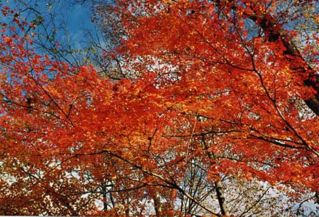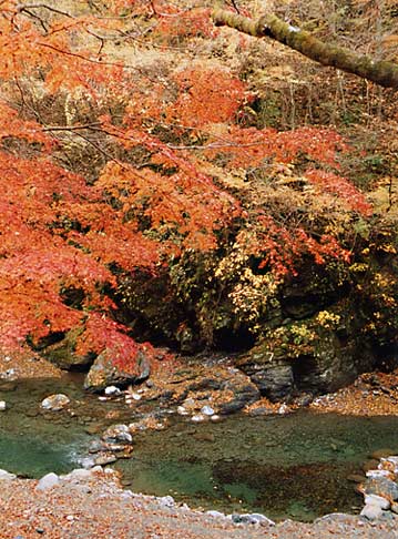 渓谷入り口の紅葉と、清んだ水 ここは釣り場です。