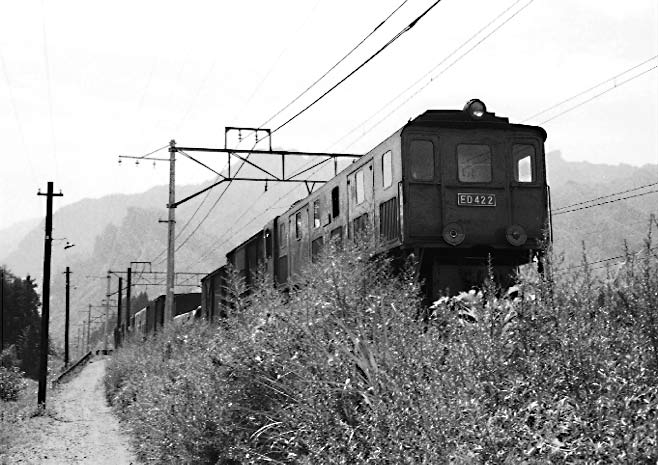 これも熊の平にて、峠を降りる上り貨物列車、当時は貨物もかなりの本数でした。