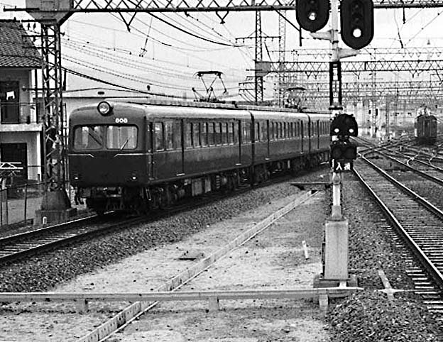 小型車天国奈良線に1955年颯爽とデビューした600V湘南顔の初期高性能車モ800 ステンレスの帯にバンビのHMを付け、足元はハイジの国のシュリーレン、生駒山中を カッ飛び、上六〜奈良を25分で走破する特急として大活躍。しかし車体断面は従来の 旧生駒トンネルに合わせた小型車並、新生駒トンネルが開通して大型車8000系 の 全線運用が始まったのが凋落の第一歩、最後は伊賀線に転じその一生を終えました。 《1968年当時の近鉄写真を御覧になりたい方はコチラをクリック》 近鉄奈良線 西大寺 1968-3 |