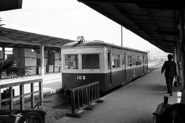 ハ〜イまたも出ました厚顔無恥の反則技、今回のエセ湘南は玉野市営電鉄、ドゥ〜ダッ! シッカシ”ドゥ〜ダッ”って言われても、これが湘南顔なら尾小屋のキハ1も湘南顔ダヨォ〜 もっとも、コンナ反則技使わなきゃ一枚物の玉野市営なんかUPしようが無いもんでして、 ネタのB級さに免じて御容赦を。まぁソンナコンナで言い訳が長くなって仕舞いましたが 今回の主役はキハ103・・・えっ〜キハ?キハって気動車でしょ?電鉄じゃなかったの? な〜んてこと「鉄」エキスパートの皆様はマサカおっしゃらないでしょうネ。元は私鉄だった 「備南電鉄」所が経営難の為に1956年に玉野市に身売り、めでたく「玉野市営電鉄」と 相成りました。しかし、経営が変っても営業成績は一向に好転せず開業からいた3両の 電車を琴電に叩き売り、1964年に電気から内燃に動力変更しました。その時あらたに 導入した気動車の一つが、写真の九州熊本の熊延鉄道から来たエセ湘南顔キハ103 元々は機械式でしたが、玉野市営電鉄ではトルコン式に改造して運用していました。 その後、玉野市営電鉄は数々の努力も空しく、車社会の波にのまれ1972年に廃止、 本四動脈だった宇野駅のホームの片隅から発着していた、この鉄道の存在に気が付く 人は少なかったようですね。 玉野市営電鉄 宇野 1971-5 |