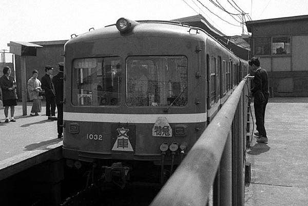 今回の湘南顔は京急1000系。若い方は、えっ! と思われるかも知れませんが、 あの1000系なんです。20年の長きに渡って作られたこの車両、初期型はりっぱな 湘南顔でした。1000系は地下鉄乗入れ用に、都営・京成との統一規格で作られた 車両ですが、何故か1960年までの量産1次型(含む試作車)は600系にソックリの 湘南顔だったんです。これでは当然地下鉄に乗入れできないので、1961年以降の 新造車は前面貫通型に。そしてこの湘南顔の車両も、その後前面貫通型に改造。 しかし、後で改造しなくっちゃイケナイの判っていながら湘南顔の車両を造るなんて 京急の車両関係者はミンナ湘南顔ファンだったんでっしょうかね? なお、カラー写真はTADAさんの「汽車・電車1971〜」”とりあえずの一枚”でドウゾ。 京浜急行 横浜 1967-? |