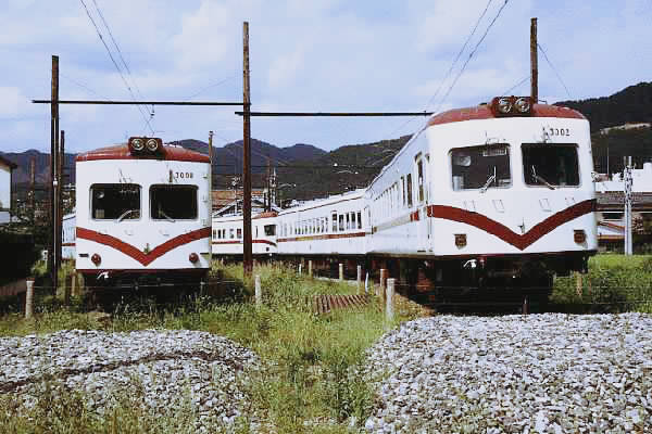 意気込んで始めた湘南顔探検団ですが、ヨォ〜ク考えると湘南フェースの車両何って そう沢山在庫が無く、色々な反則技を編み出しで今まで凌いで来ました。っと言う事は 今回も反則?アッタリィ〜、その通り、またも考えた新反則技は題して「譲渡湘南顔」 譲渡すりゃ色も形式も変わるから別の車両ダモンネっと、勝手な解釈し放題です。 言い訳永くなりましたが、今回登場のネタは新鮮、でもチョッピリ寂しい草ボウボウの 留置線にクツワを並べているのは元南海の11001系前京福の3000系、そして現在は 新生えちぜん鉄道に引き継がれている様ですが、車籍があるのか、無いのか、全車 運用から外され京福色のまま休車状態です。愛知環状鉄道からの転入車6000系も 福井口の車庫に入庫している事を考えると、このままホ〜チプレイが続く可能性大、 嗚呼彼らの運命や如何に!アテンダントさ〜ん ヘルプゥ〜っても無理ダヨナァ〜。 えちぜん鉄道勝山永平寺線 永平寺口(東古市)