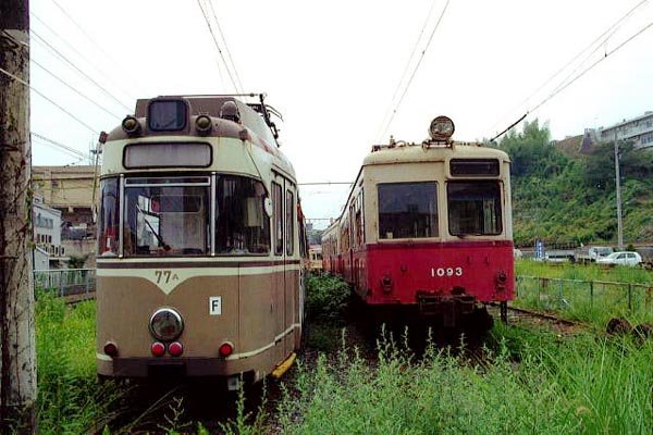 広島電鉄宮島線の1090系(右)は、広島電鉄最後の高床鉄道専用車です。写真の 1090系は1953年に京阪111+車体新造という組み合わせで誕生。新しい車体は当時 流行の「正面2枚窓非貫通」だけど扁平、いわゆる思鉄風湘南顔で登場しました。 廃車になってしばらく荒手車庫に放置されていましたが、2002年に解体されました。 これで終わればゴク普通の旧型電車、シカシ、1093の歴史はこれで終わらなかった、 な〜んと!アメリカの保存電気鉄道博物館、「シーショア・トロリー・ミュージアム」で 復元中の「ナルシサス号」へ台車と電気、空気制動部品を供給したのでした。いずれ 広島電鉄 荒手車庫