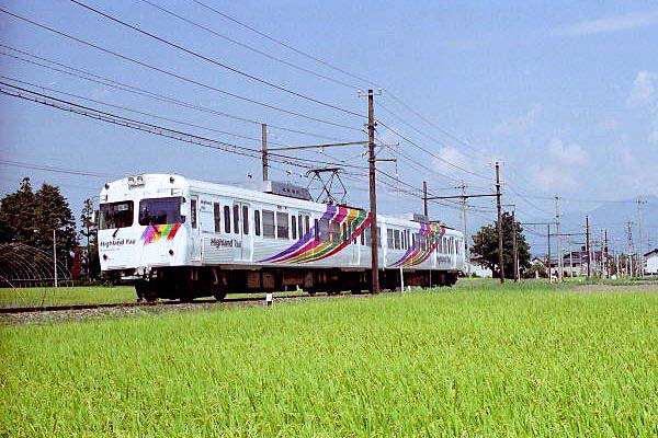 前回登場の元・東急青ガエル5000系老朽化の代替として登場したのがステンプラと 呼ばれた元・京王井の頭線3000系。今までは地味な車両ばかりの松本電鉄でしたが 当然クーラーが載り全車冷房化を達成。本家井の頭線では鉄の評判イマイチだった ぴったりマッチして松本電鉄ではナカナカの好評です。 アルプスの山々をバックに快走する「アルピコカラー」の電車は、とてもセコハンには 見えません。21世紀のモダン湘南フェースとも言えるかも知れませんね。 松本電鉄 新村〜三溝