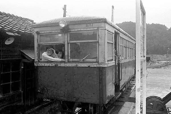 とうとう出しちまいました。まあ、表紙のお題目にも<正面2枚窓なら見境無くUP>と 書いてあるんで、大目に見てやって下さい。ってな訳で、今回は超反則湘南フェースの 尾小屋鉄道キハ1の登場で御座います。尾小屋鉄道と言えば非電化ナローのままで 1977年の廃止まで走り、古きよき時代の軽便鉄道の面影をオジサン鉄の青春時代に 体験させてくれた鉄道でした。キハ1は写真を見れば判るように当然湘南Fを意識した 車体ではありませんよね、単にナローゲージの為に車体幅が狭く、正面に3枚の窓を 設ける必要が無かったから2枚窓になっただけの事なんです。この2枚並んだ窓の内 右側が運転席で、左側はどう見ても鉄な乗客が嬉しそうにしている様子で判るように、 所謂鉄チャンシートになっていました。こんな軽便の一番前に乗って窓を大きく開けて カブリツキながらヘロヘロの線路を揺られて行く旅は、今では叶わぬ夢物語ですね。 湘南フェース探検団UP車両のランキングに是非、投票して下さいネ。 尾小屋鉄道 金平 1976-8 |