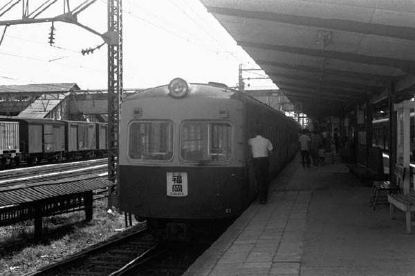 そっくり返って登場は西鉄のモ20系の制御車ク50系61号車です。マトモと威張っても 反則小難Fと比べての話、このク50系もよくよく見れば、ちょっとノッペリ湘南フェース。 モ20系は2M1Tの3両固定編成が6本あって,100系とともに本線普通列車の主力として 活躍していました。近頃モウそろそろ引退と言われている、600系や700系なんかは まだまだハナタレルーキーの時代でした。写真の61号車もモ21とモ22を相棒にして 筑紫平野を吊り掛け音で鼻歌を歌いながら、急がず騒がず時間に追われず、悠々と 各停の運用に就いておりました。所で、折り返しで停車中の駅風景をちょっと見ると、 お隣の鹿児島本線の線路には貨物列車、ク50系の線路の横には未だに、何のために 使われたか、判らない竹のはしご、ホームには木製ベンチに鳥居型の駅名板、どれも これも、オジサン鉄には堪らない、当時のお約束小道具ですね。 湘南フェース探検団UP車両のランキングに是非、投票して下さいネ。 西鉄大牟田線 大牟田 1970-8 |
