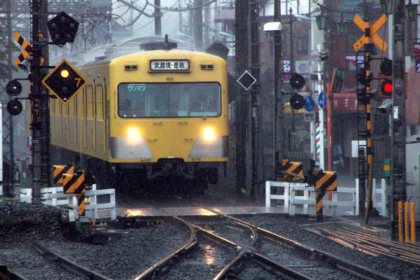 1969年、西武としては初めての山岳路線となる、秩父線への運用を前提に造られた 湘南フェース王国西武を作り上げた所沢工場集大成の逸品。当然台車だってモハは 勿論、クハだってフッカフッカの空気バネ、TR11なんぞとは無縁でございました。 急行のヘッドマークも誇らしく、150kwの強力電動機、抑即、発電ブレーキを駆使して 秩父線を駆け抜けたも、今では遠い昔の出来事になってしまいました。激しい春雷の さなか、昔の仲間が集まった独立路線の多摩川線で地味なローカルの運用に勤しむ 101系もそんな事を考えていたのかも知れません。 湘南フェース探検団UP車両のランキングに是非、投票して下さいネ。 西武多摩川線 多磨 2005-5 |