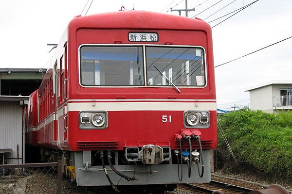 多い地方中小私鉄の中にあって、全てが自社発注のオリジナル車という健闘ぶり。 2000系などがありますが、これらの車両達の間でひっそりと影を潜めているのが、 このモハ51。どうやら分類上は30系の最終増備車という位置づけらしいのですが、 他の30系と外見もカナリ違うし、カルダン駆動でモーター出力もアップされており、 他型式を乗らなかったのが不思議なくらいです。ともあれ、1958年から22年の長期に 渡り製造された30系のラストランナーは、姿も形も変わって登場したものの、新しい 型式も貰えず、たった1編成の徒花・・・ もとい、1000系への架け橋となったのです。 湘南フェース探検団UP車両のランキングに是非、投票して下さいネ。 遠州鉄道 西鹿島 2006-6 |