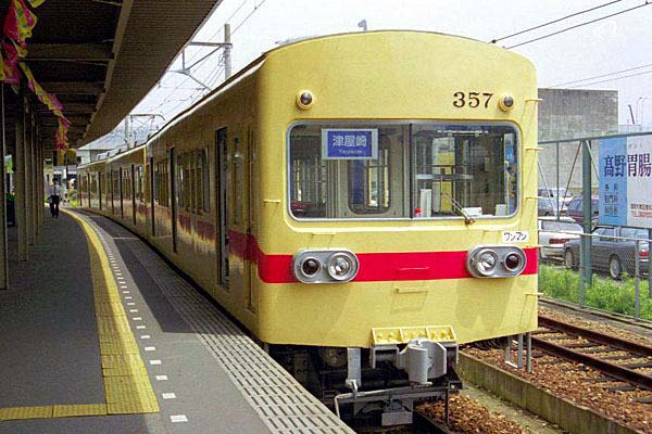 いくらなんでも反則どころの騒ぎじゃ済まない・・・かな? って言ったて、もうこうやって 無理やりアップぅ〜しちゃったから、湘南Fファンのミナサン諦めて下さいまっせ〜。 転入組です。写真のク357はMc+M+Tcの3両固定編成ですが、1948年(S23年)製の 2両編成の間に、後々部品流用で作った電動車を挟み込んで3両編成としたものです。 しかし大手私鉄で、しかも福岡近郊という立地でありながら、この行先表示板の文字が 湘南フェース探検団UP車両のランキングに是非、投票して下さいネ。 西鉄宮路岳線 貝塚 1998-5 |