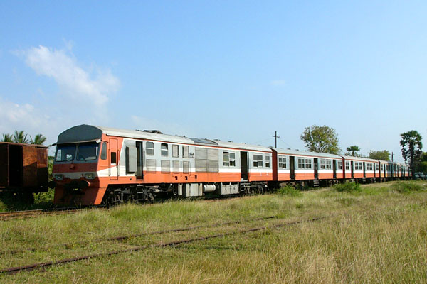このスターウォーズ風湘南フェ−スが通過する線路脇の見慣れない信号機やヤタラ 広い線路幅、更には列車進行中にもかかわらず開けっ放しの乗降ドア、今まで何回か 登場した洋モノとも雰囲気が違うの判りますよね。実はコノ車輌はインド亜大陸の南端 に浮かぶセイロン島にあるスリランカ国鉄のS9型通勤用気動車なんです。と言う事は コノ写真は当然頂き物、このググたって中々お目にかかれない珍品湘南フェースは 「旧型貨車保存図鑑」管理人#9999様から頂きました。スリランカ国鉄最新鋭S9型は なんと中国製、それもトルコン車じゃなく電気式なんだそうです。