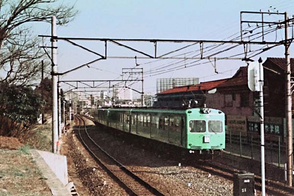 井の頭の1000系は1000系でも、現在走っている銀々ギラギラの京王電鉄井の頭線 1000系じゃ御座いませんよ。写真の1000系は「京王帝都電鉄」井の頭線の1000系、 通称グリーン車ってやつですよ。当然銀箱とは無縁の18m鋼体車で、井の頭線初の カルダン駆動、所謂初期高性能車って車輌です。生まれは1957年ですから、1954年 生まれの似たようなご面相をした東急旧5000系とはほぼ同期ですね。以前に登場 した時は正面窓の内側に長方形のサボと言う情け無い姿でしたが、今度はお約束の 方向板を正面に刺してのお出ましです。ヤハリこの時代の私鉄電車、車体正面には キッチリ方向板を付けてがあった方が、自慢の湘南フェースがキリリと締りますね。 湘南フェース探検団UP車両のランキングに是非、投票して下さいネ。 京王帝都電鉄井の頭線 駒場東大前 1967-3 |
