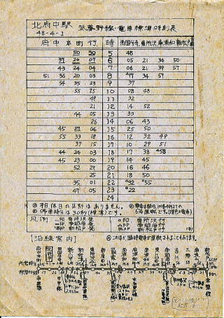 北府中の時刻表、駅員さんの手作りですね。 沿線案内入りが泣かせる!!