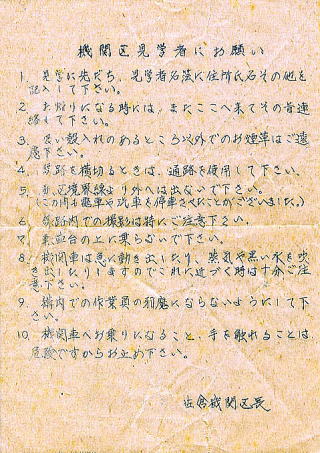 佐倉機関区では無罪放免の前にこんな藁半紙の 注意文をくれました。今と違って撮影者に親切でしたね。