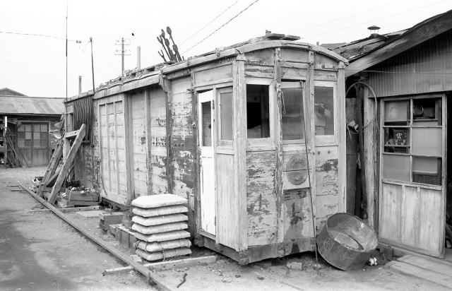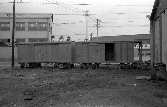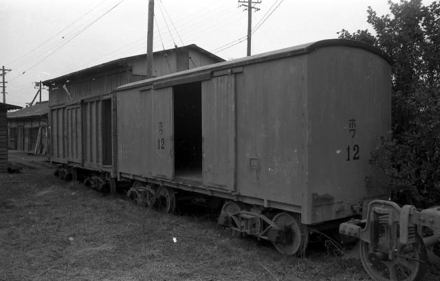 ホワ1(向こう)、ホワ12(手前) 1971(昭和46)年4月11日この日を最後に福島交通は鉄道路線だけの会社となりました。 さよなら、救助網と朝顔連結器の木造鋼体化車たち