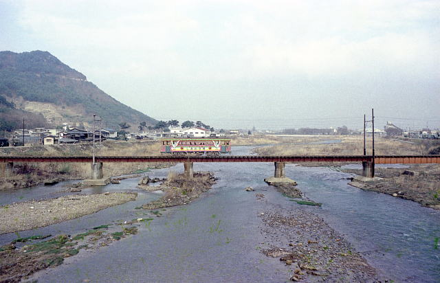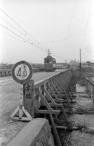 木橋の幸橋上を行く1107 未舗装の本内で交換待ちの1107 軌間は1067mmですがナローゲージの車両のような幅の狭い車両でした。これは大正15年の