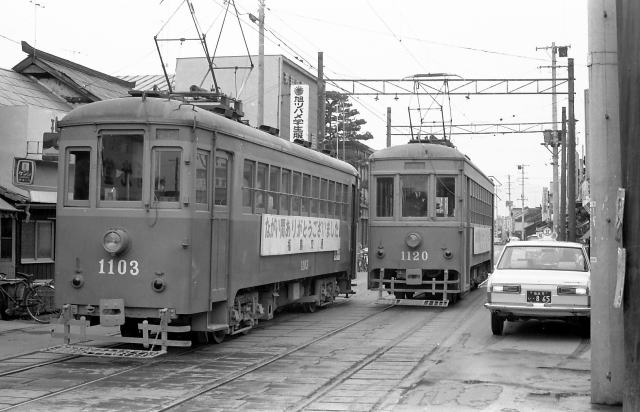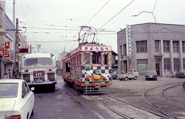 | その昔、国鉄福島駅前より福島交通軌道線が保原、梁川へと走っておりました。 かつては掛田、伊達への路線もありましたが順次縮小となり、’71(昭和46)年 4月11日をもって全線廃止となりました。友人と上野から夜行普通列車の青森行 421列車の旧型客車に揺られ、廃線2日前の軌道線を訪れました。 廃線間近でしたので、ほとんどの車両に「さよなら」の垂れ幕を掲げていました。 それでは平成の時代では味わえない浮世離れした風景をご覧ください。
