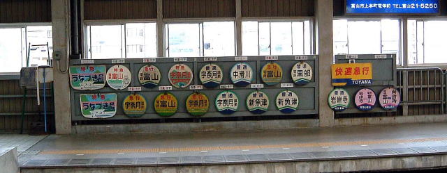 電鉄富山のホームには、ヘッドマークがずら〜りと並んでお出迎え。