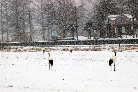 雪の降り出した茅沼に、運良くタンチョウが4羽いました、汽車が来るまでいるかな?