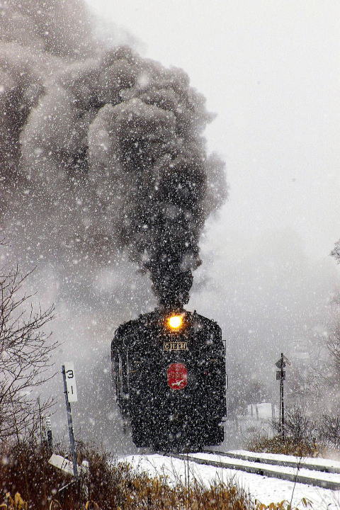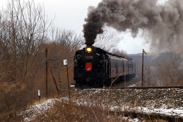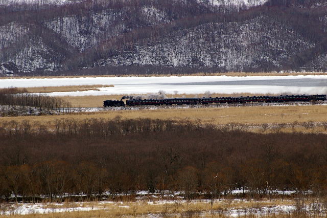 返しの撮影地は裏二本松下の直線区間で待つこと1時間、通過直前に・・・ 06.3.20 茅沼→塘路
