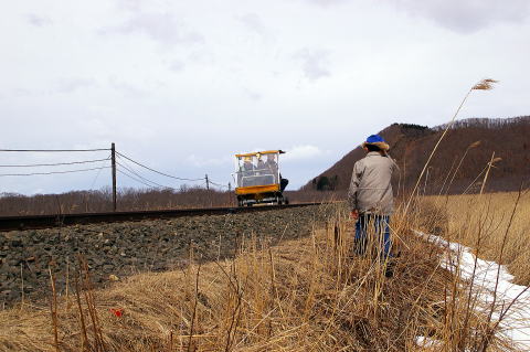 細岡踏切から入っていくと、夢が丘をバックに突然モーターカーが!! 06.3.20 塘路→細岡